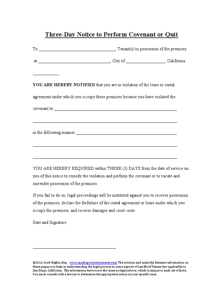 3 Day Notice to Perform Covenant or Quit California San Diego Eviction