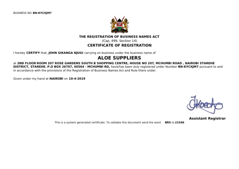 Business Registration Certificate PDF