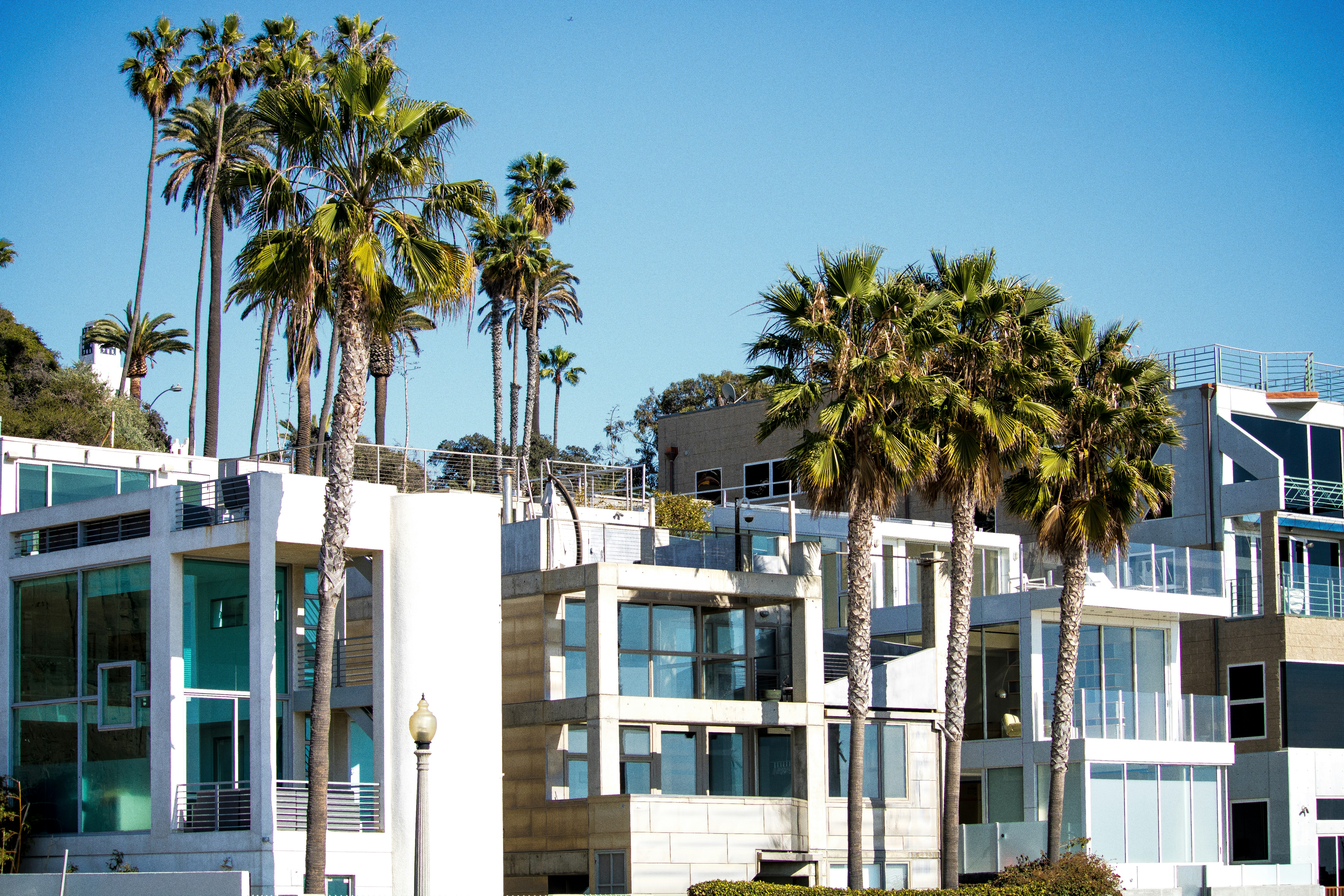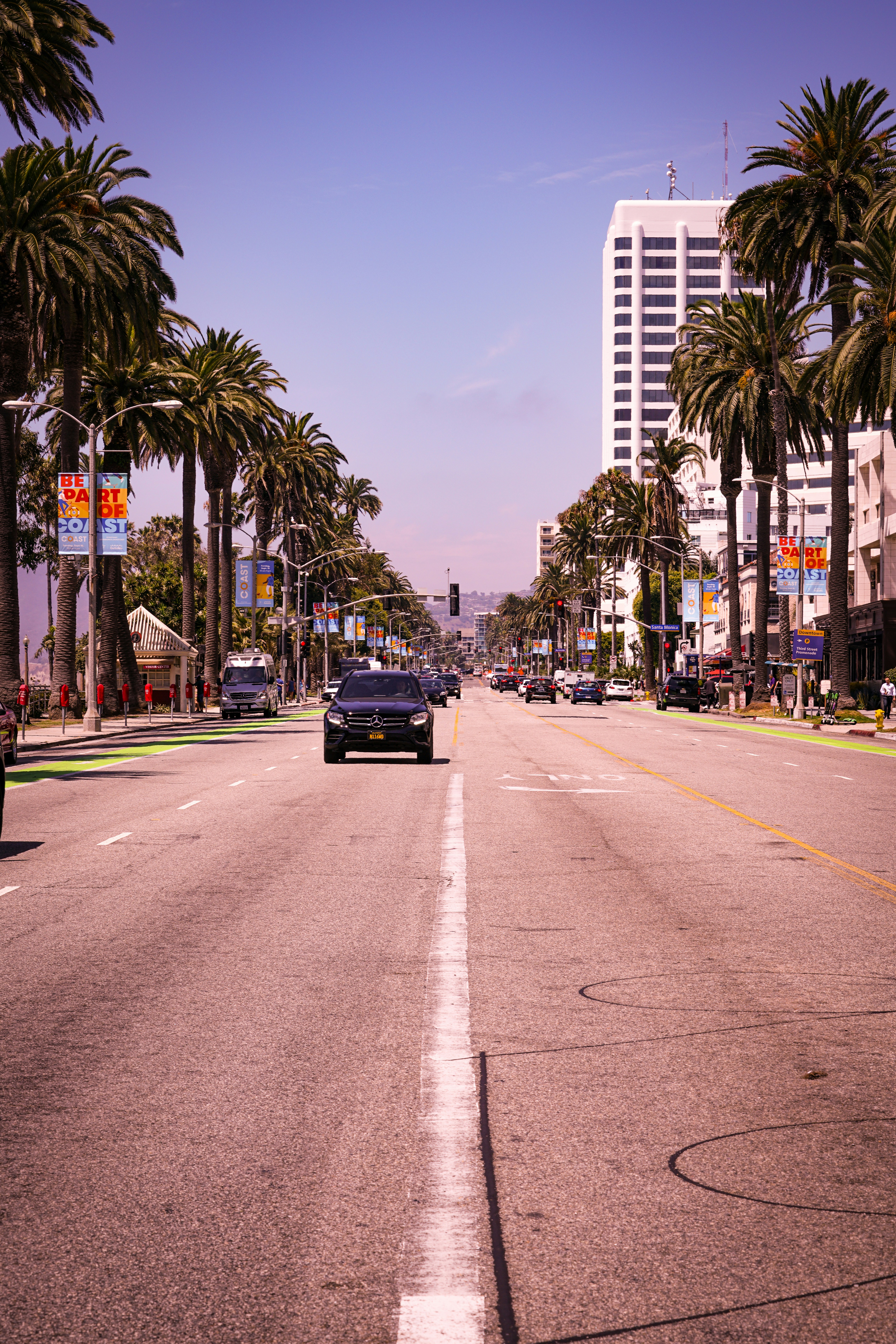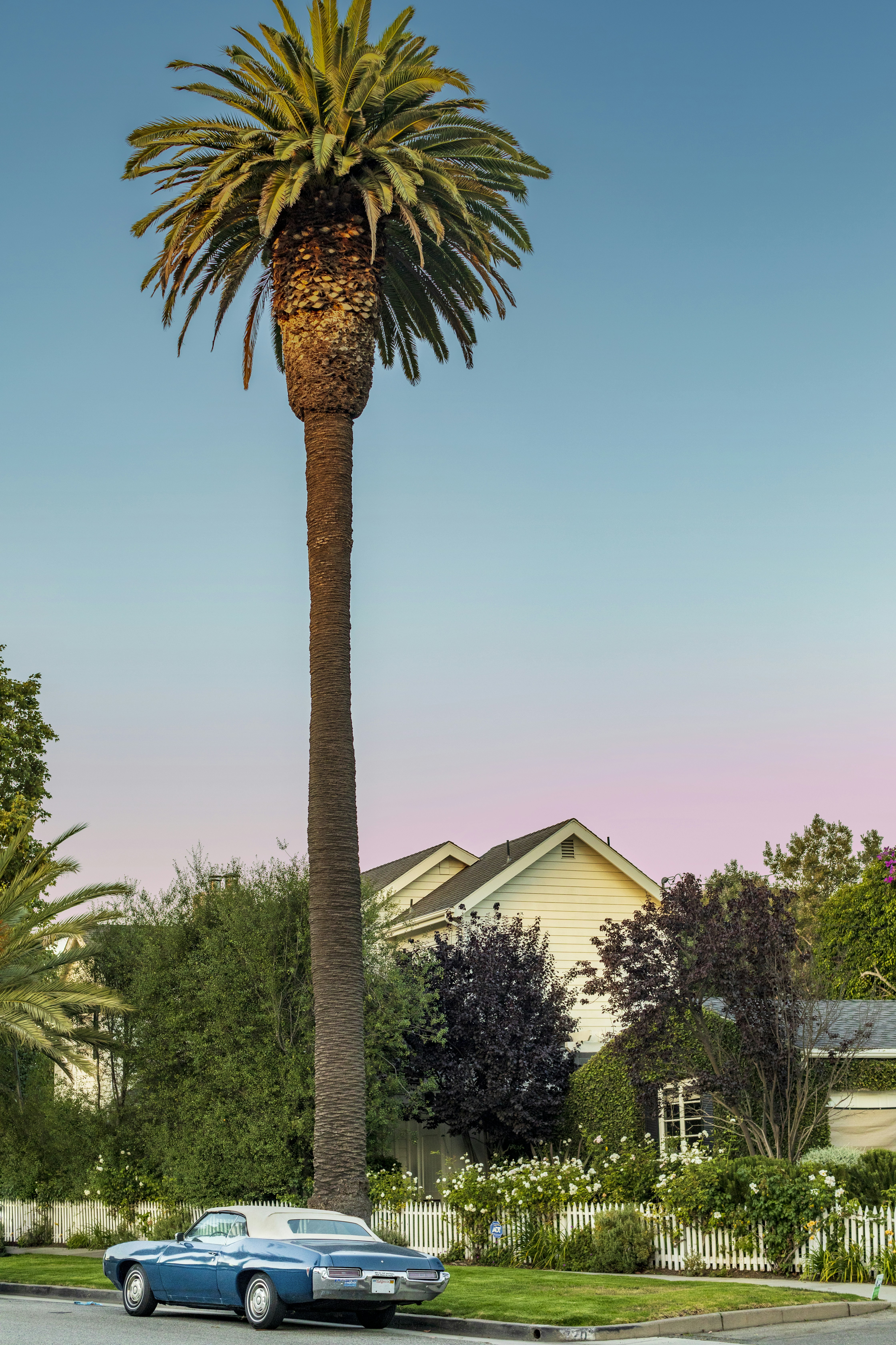 Blue convertible car near coconut palm tree photo Free Santa monica
