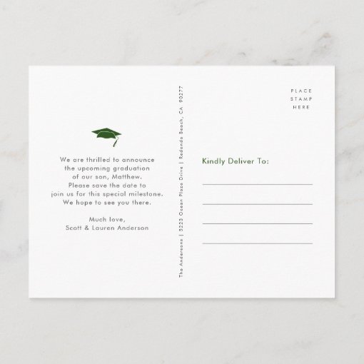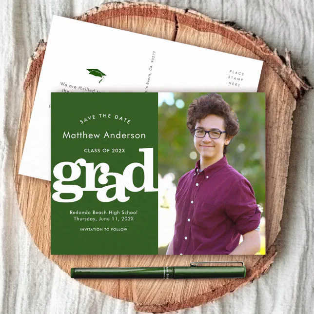 Green save date graduation photo bold typography invitation postcard