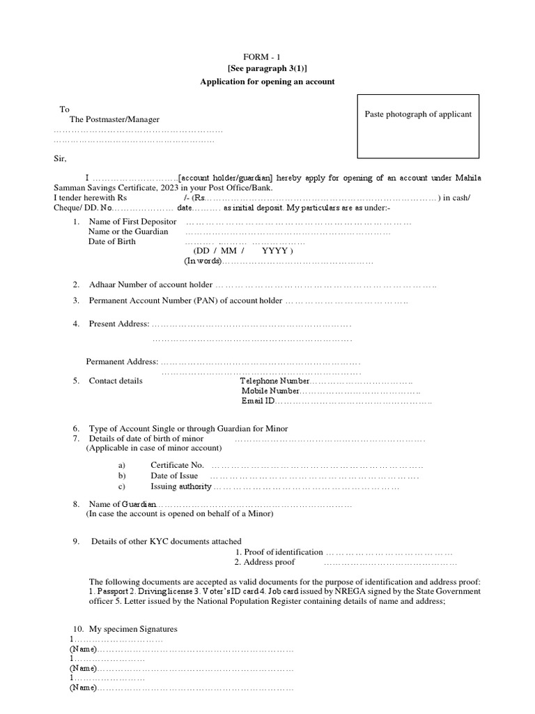 Application form Mahila Samman savings certificate (MSSC) Opening