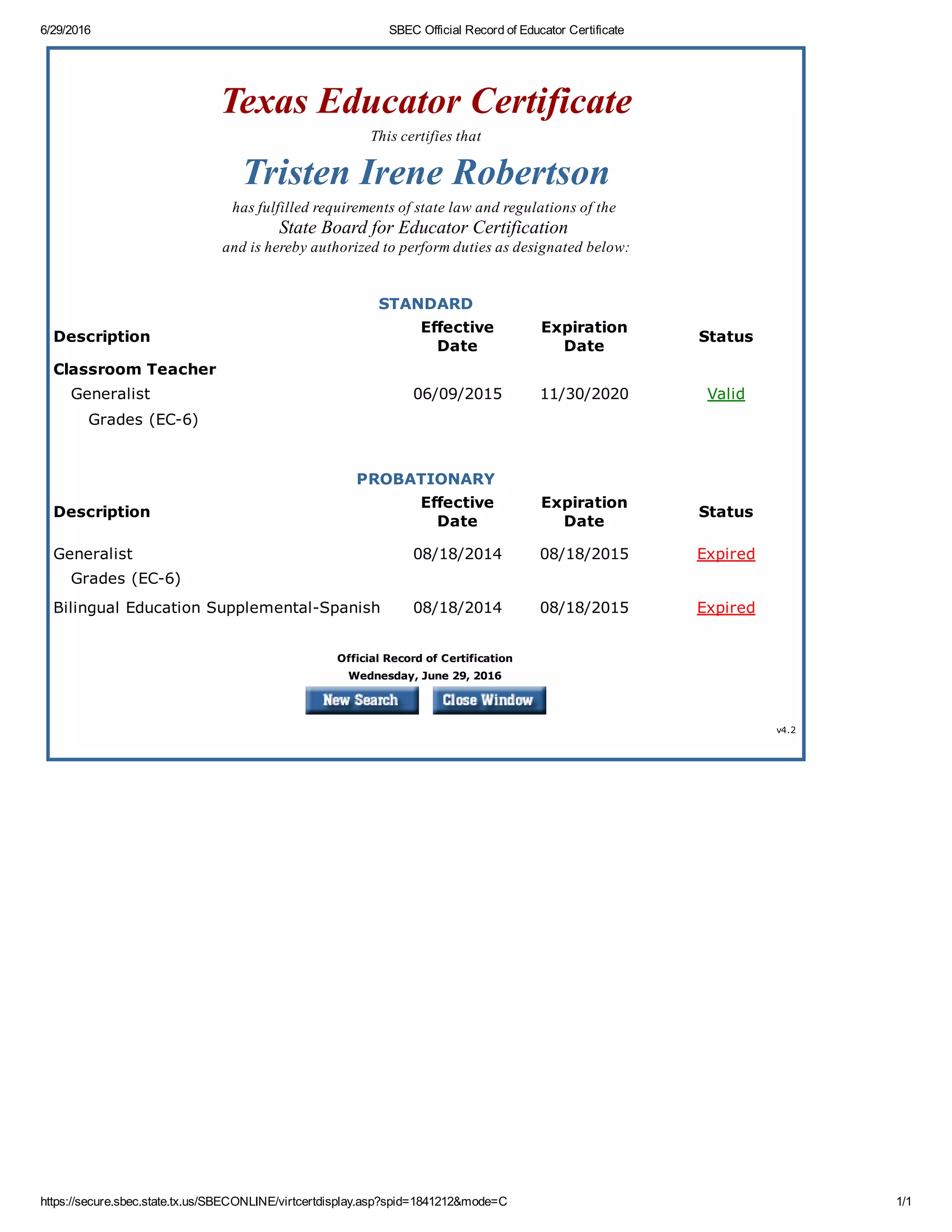 SBEC State Board for Educator Certification Inscription on the Sheet