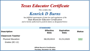 SBEC Official Record of Educator Certificate ctsp tamu Doc Template