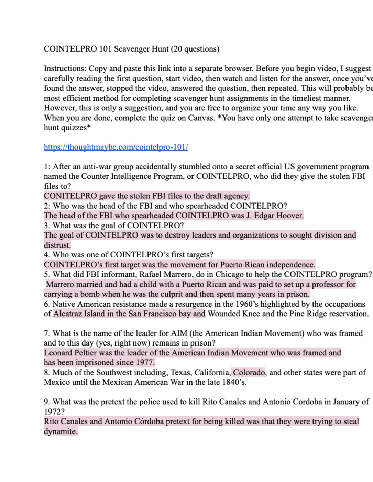 Cointelpro 101 Scavenger Hunt (20 questions) Gianna Aragona Google