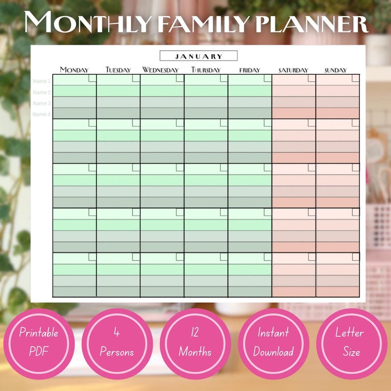 Printable Family Planner Monthly Calendar for up to 4 People Family