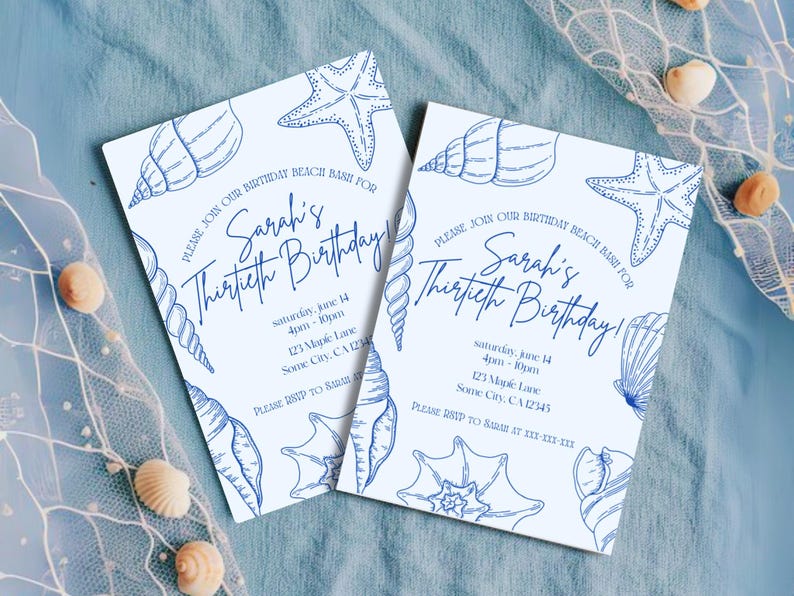 Blue Seashell Birthday Invitation Template: Beach Party Canva Editable