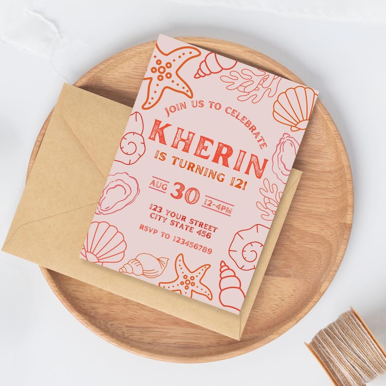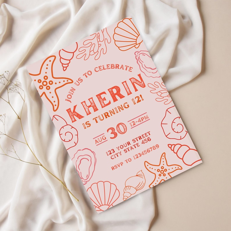 Coral Seashell Birthday Invitation: Tropical Beach Party Editable