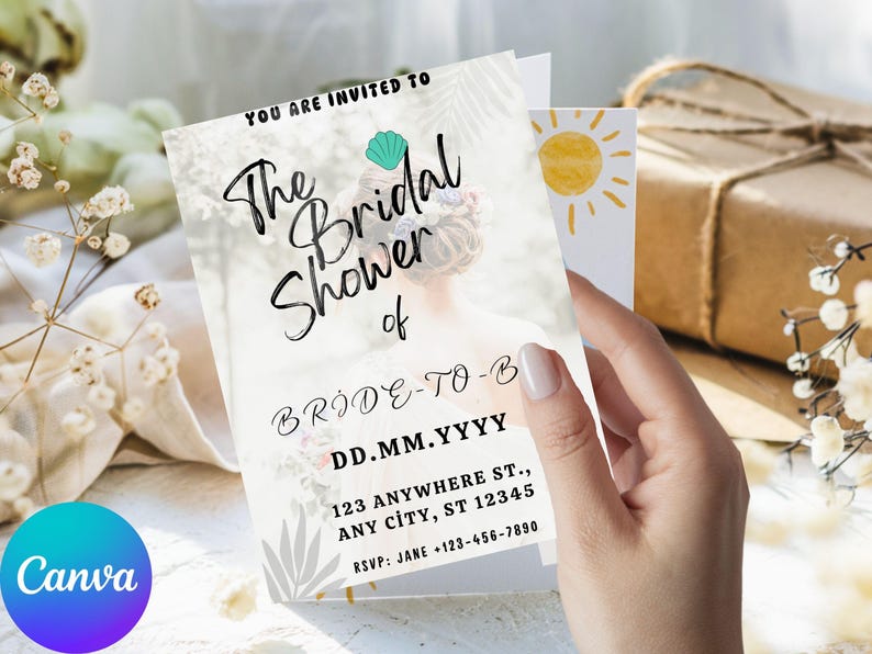 Rustic Boho Seashell Bridal Shower Invitation Editable Canva Template