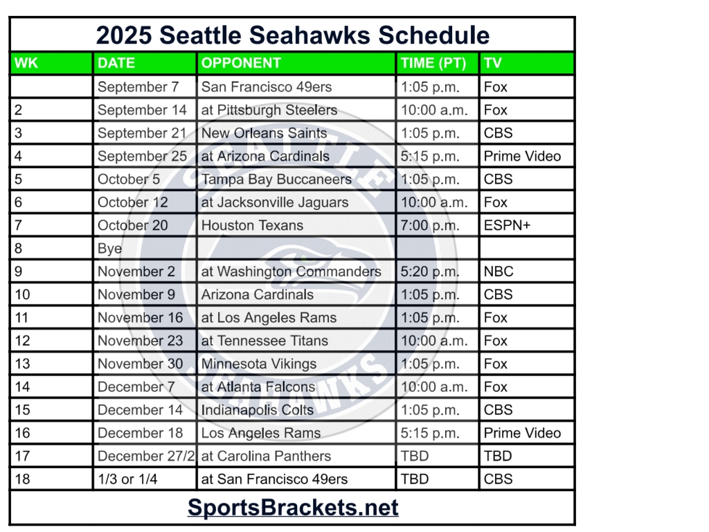 Printable 2025 Seattle Seahawks Schedule Matchups and TV Broadcasts