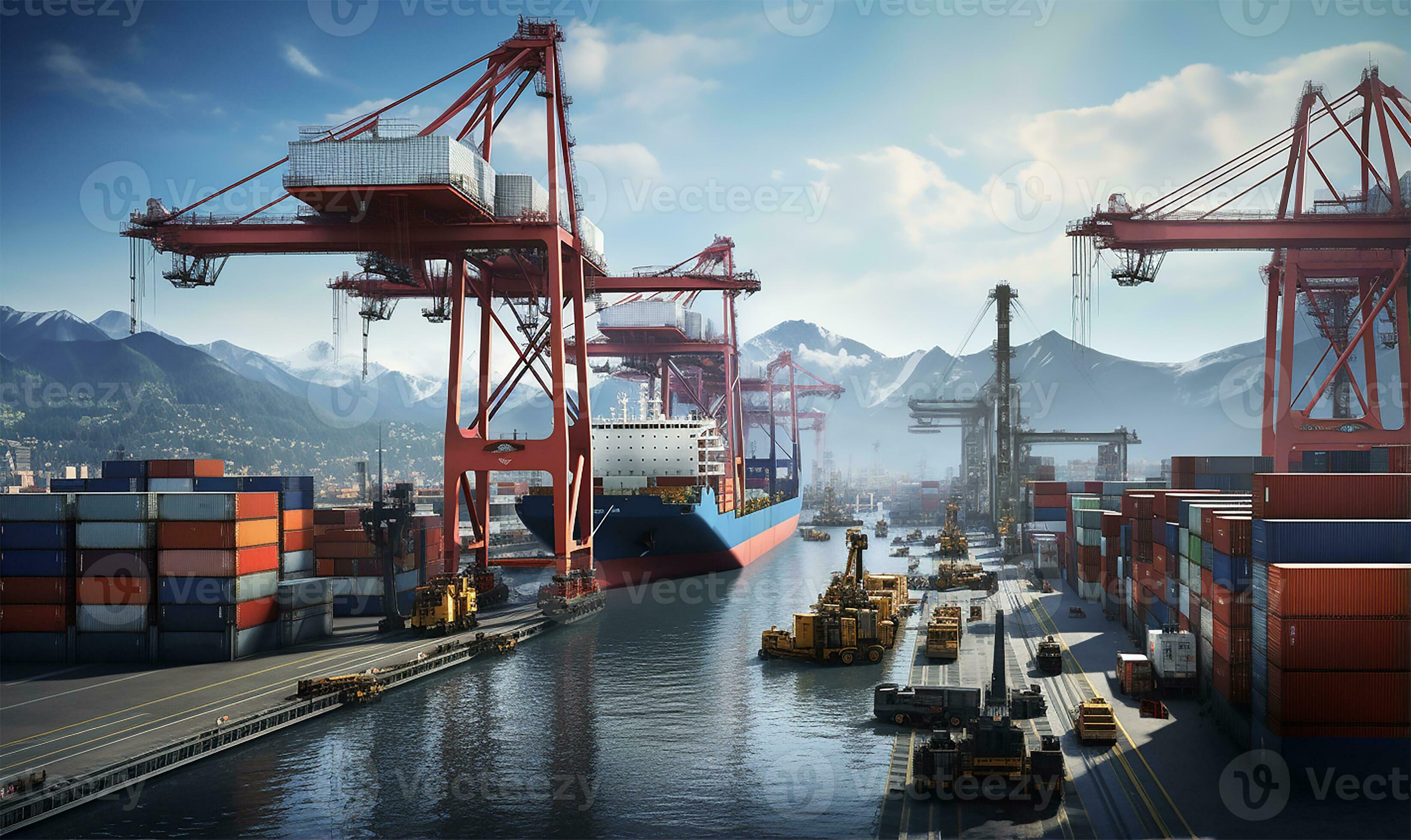 bustling seaport featuring cargo ships being loaded and unloaded AI