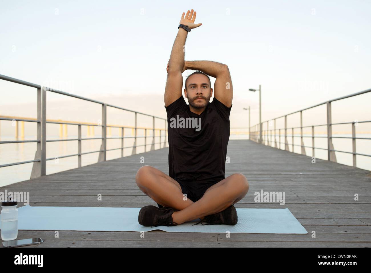 man showcases flexibility with seated yoga pose stretching arm outside