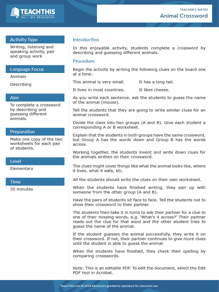 Animal Crossword PDF Crossword English As A Second Or Foreign