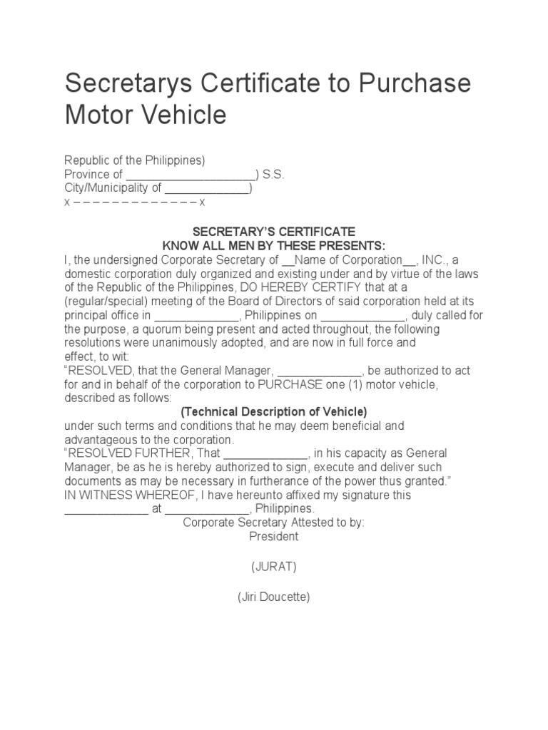 Secretarys Certificate To Purchase Motor Vehicle PDF