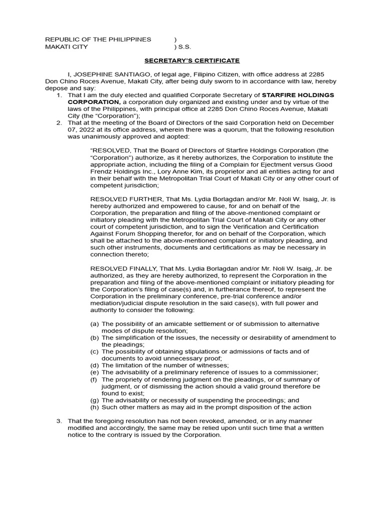 Secretarys Certificate NonExistence Corp Dispute PDF