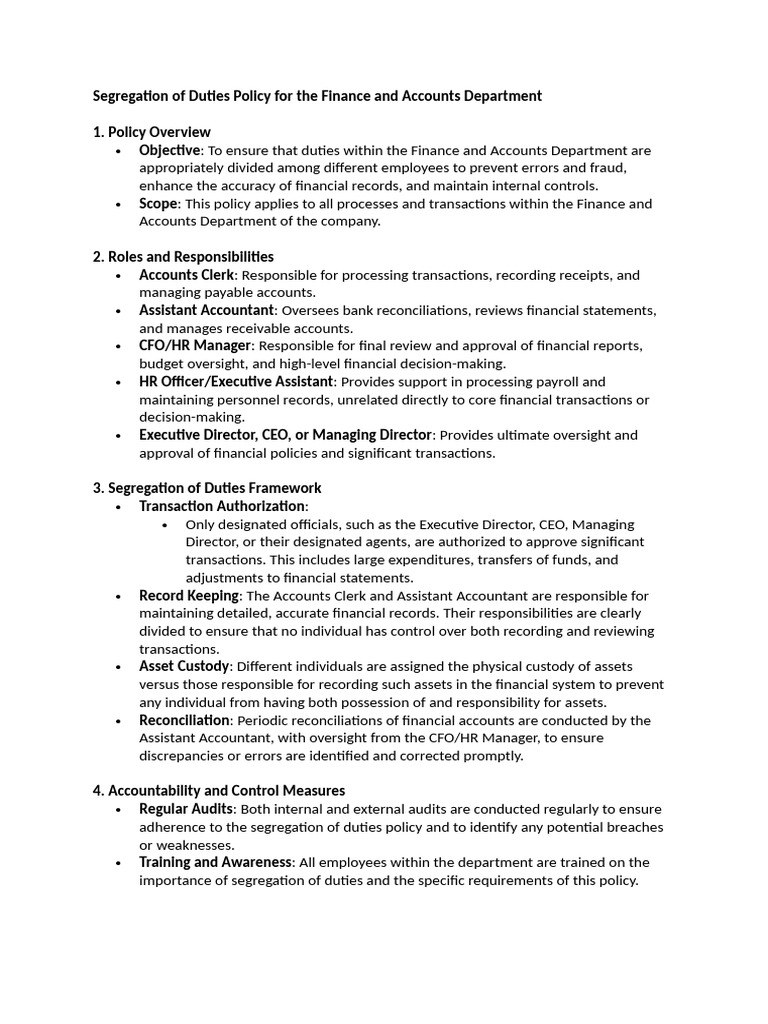 Draft Segregation of Duties Policy For The Finance and Accounts