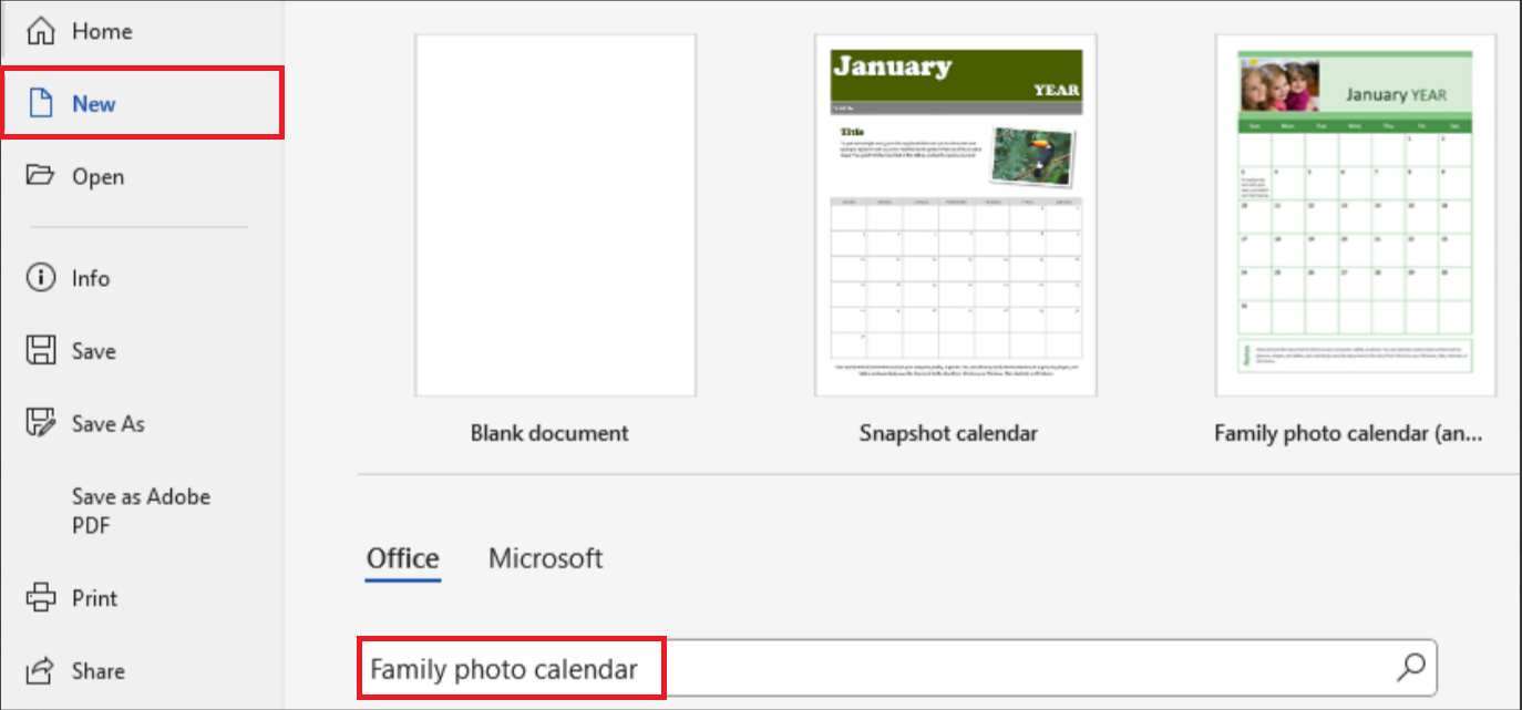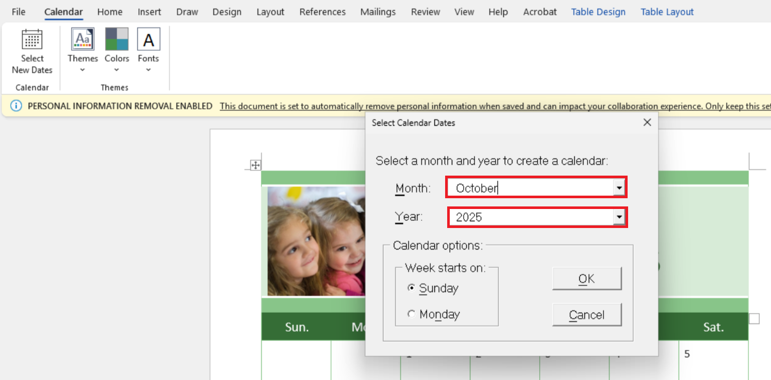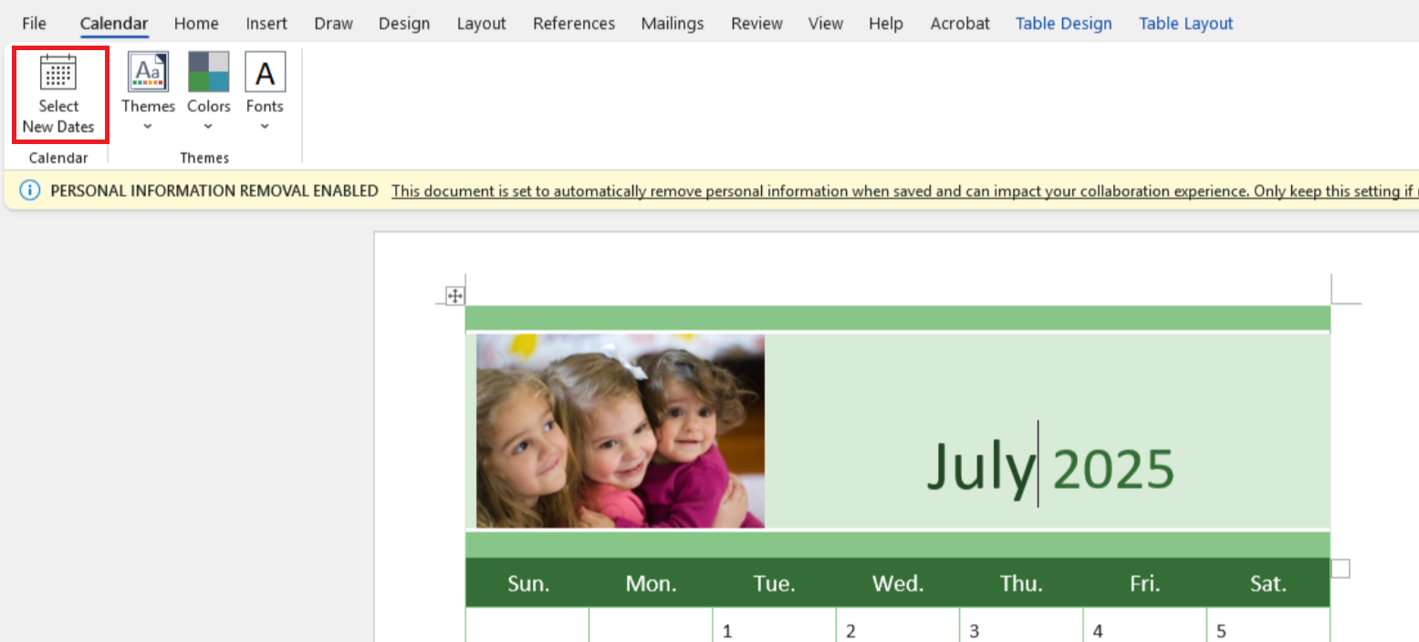 Select New Dates Calendar Word