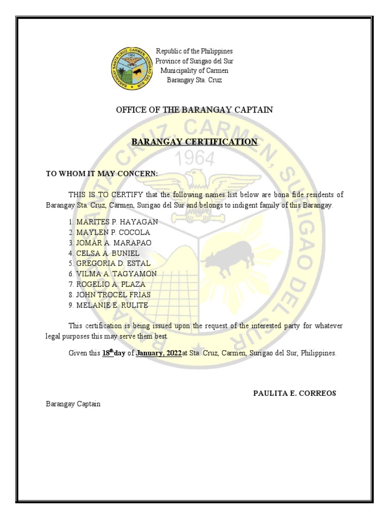 Barangay Sta Cruz Residency Certification PDF