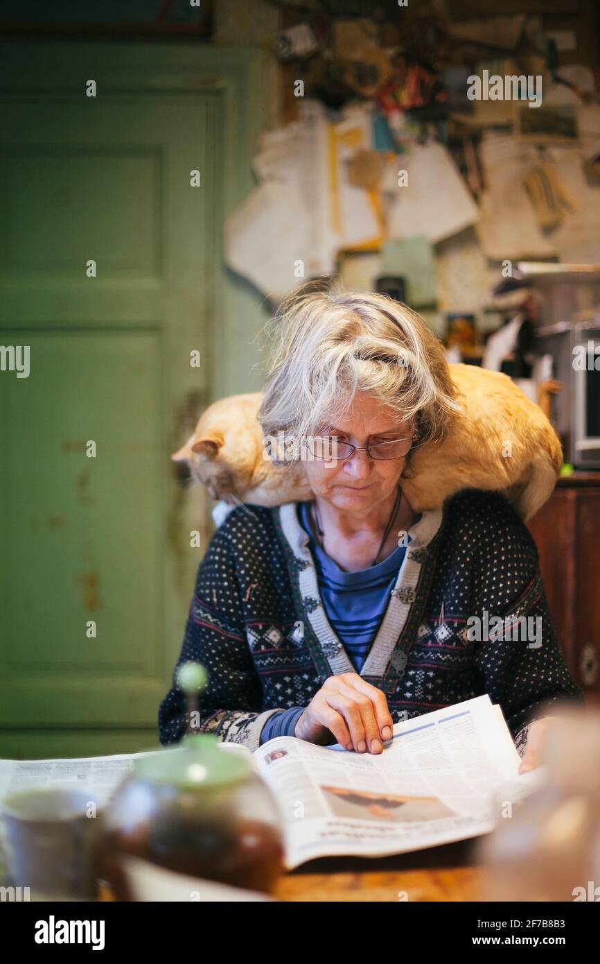 Senior woman cat reading hi res stock photography and images Alamy
