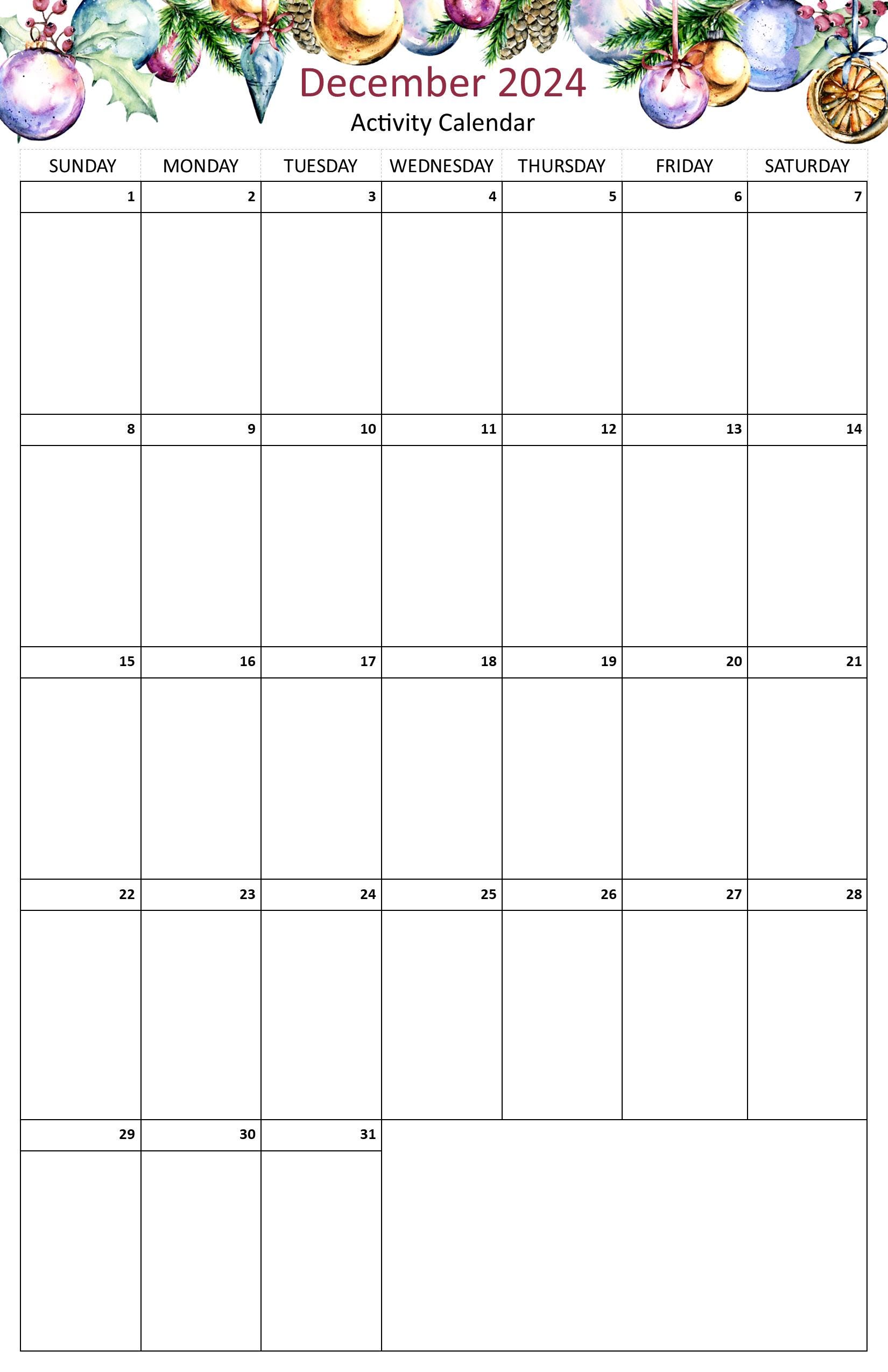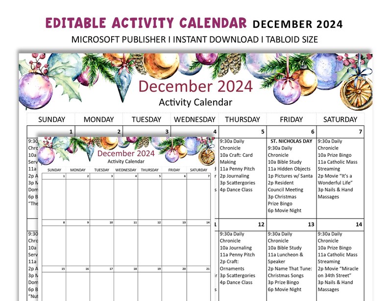 Editable December 2024 Senior Living Activity Calendar tabloid 11 X 17