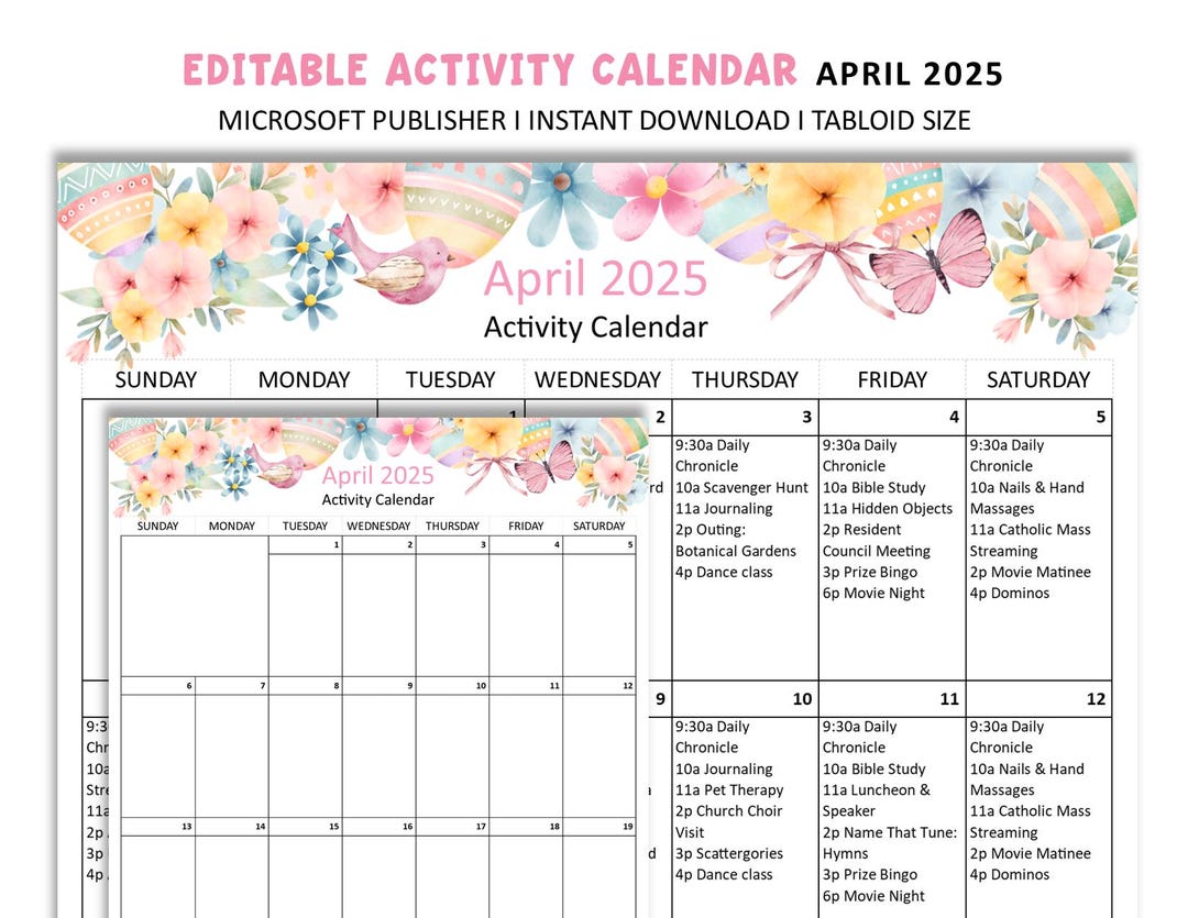 Editable April 2025 Senior Living Activity Calendar tabloid 11 X 17