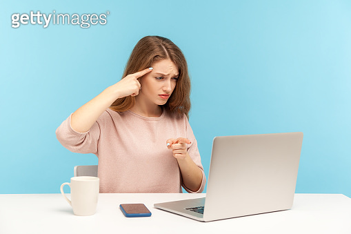 Displeased Woman Pointing at Camera Show Stupid Idiot Gesture Finger