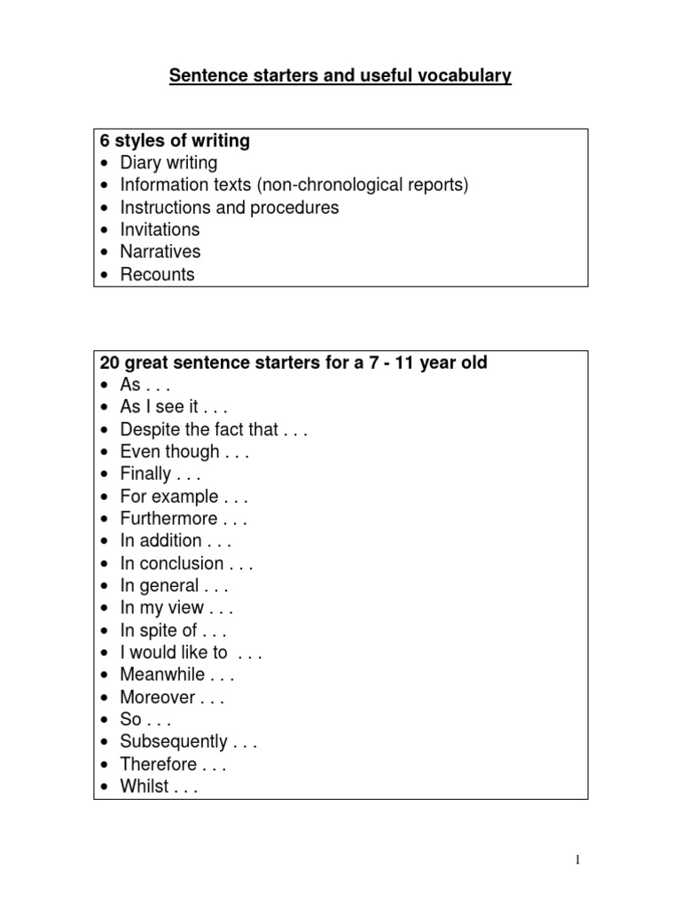 Sentence Starter Prompts Writing expressions Writing inspiration