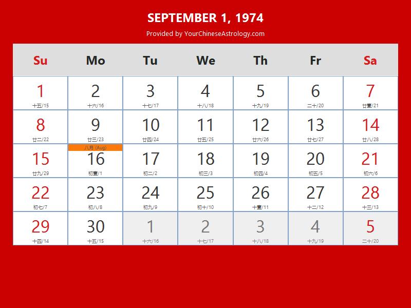 Chinese Calendar Sep 01 1974: Auspicious Things to Do and Hours Bazi