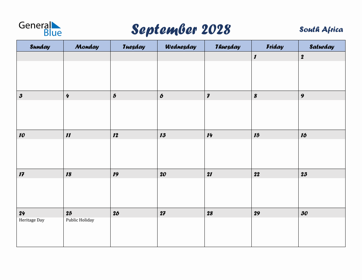 September 2028 Monthly Calendar Template with Holidays for South Africa