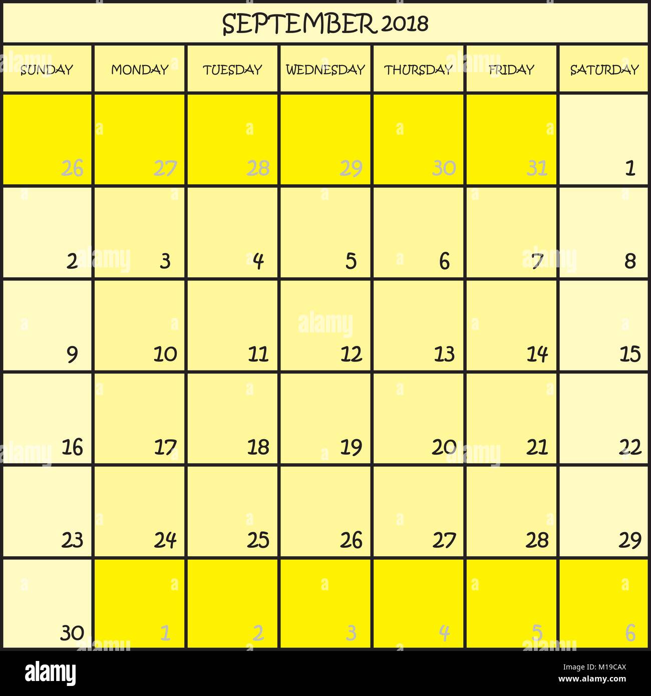 CALENDAR PLANNER MONTH SEPTEMBER 2018 ON THREE SHADES OF YELLOW COLOR