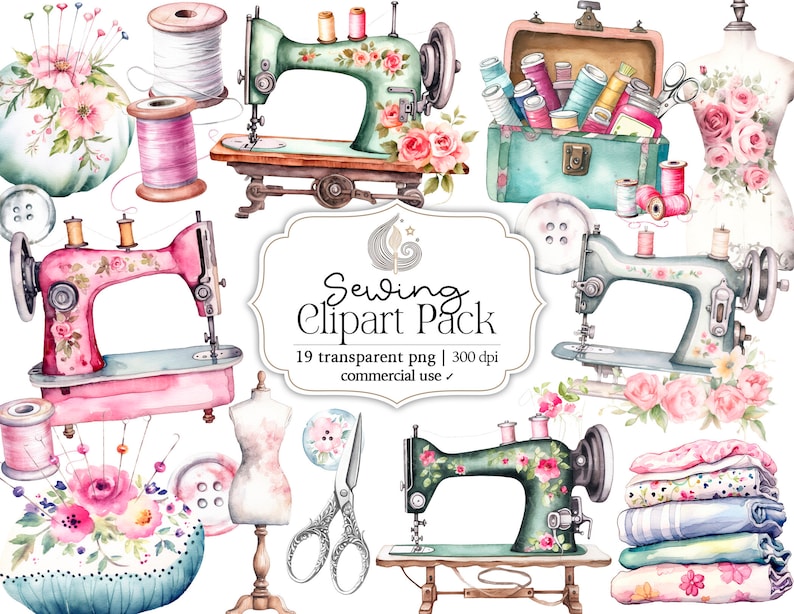 Watercolor Sewing Clipart Pack: Vintage Shabby Chic Sewing Machines and
