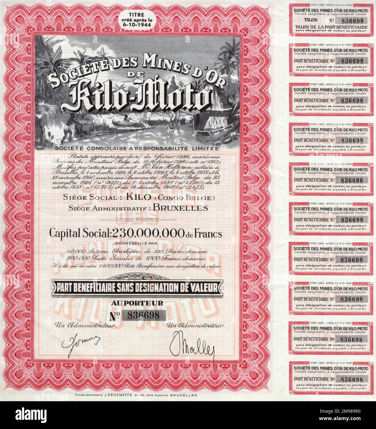 Share certificate and dividend coupons Kilo Moto Goldmines in the