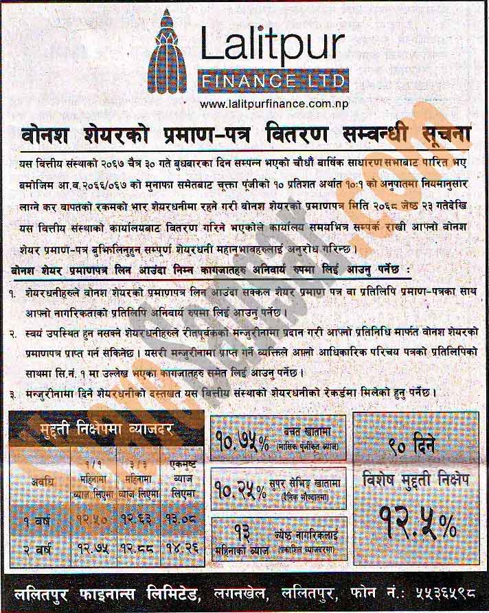 Lalitpur Finance Ltd is going to distribute 10% bonus share