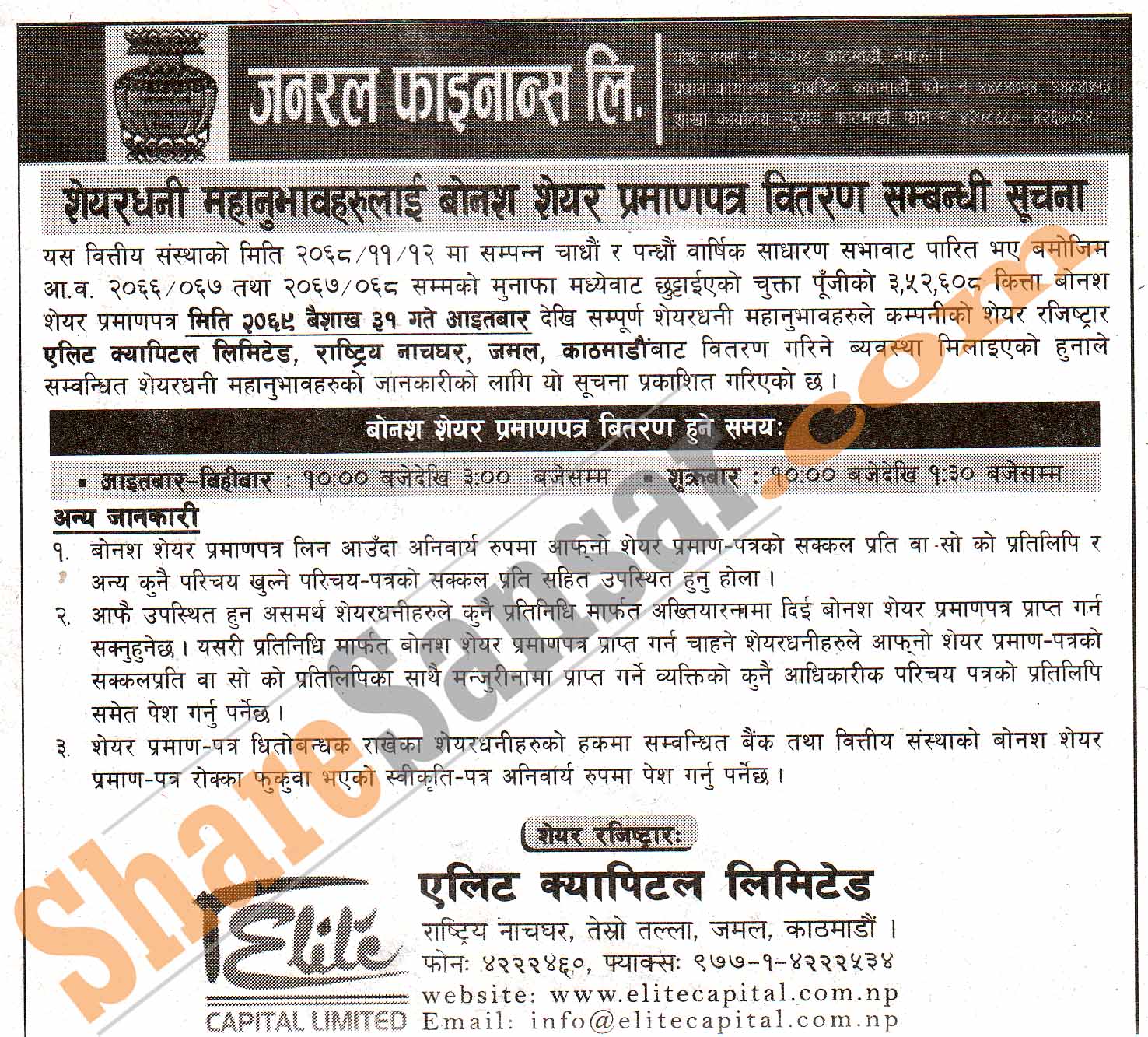 General Finance Limited is distributing 20% bonus share certificate to