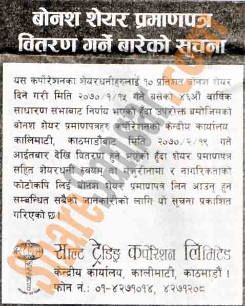 Salt Trading Corporation Limited is going to distribute 10% Bonus Share