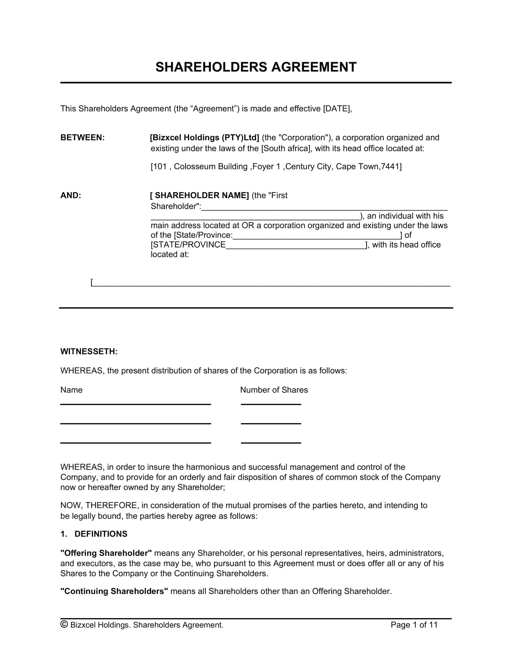Shareholders Agreement Template