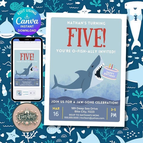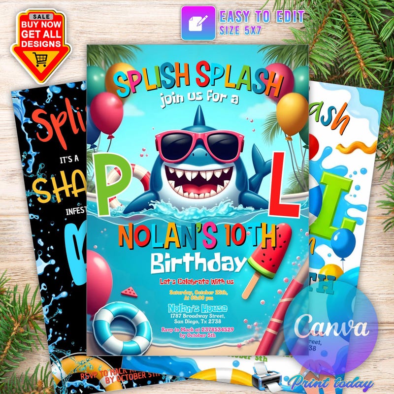 (Free Editable PDF) Simple Shark Themed Birthday Invitation Templates