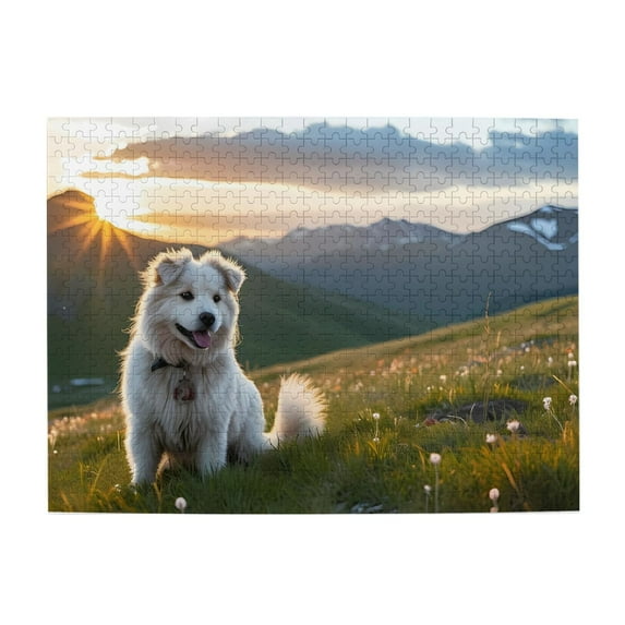 500 Piece Wooden Jigsaw Puzzle for Adults Dog Mountain Sunset Meadow