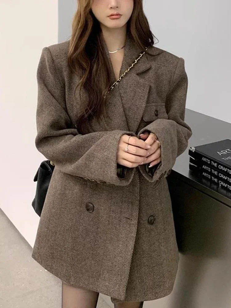 E Girl Women Beige Spring Trench Coat Plain Double Breasted Coats Lapel