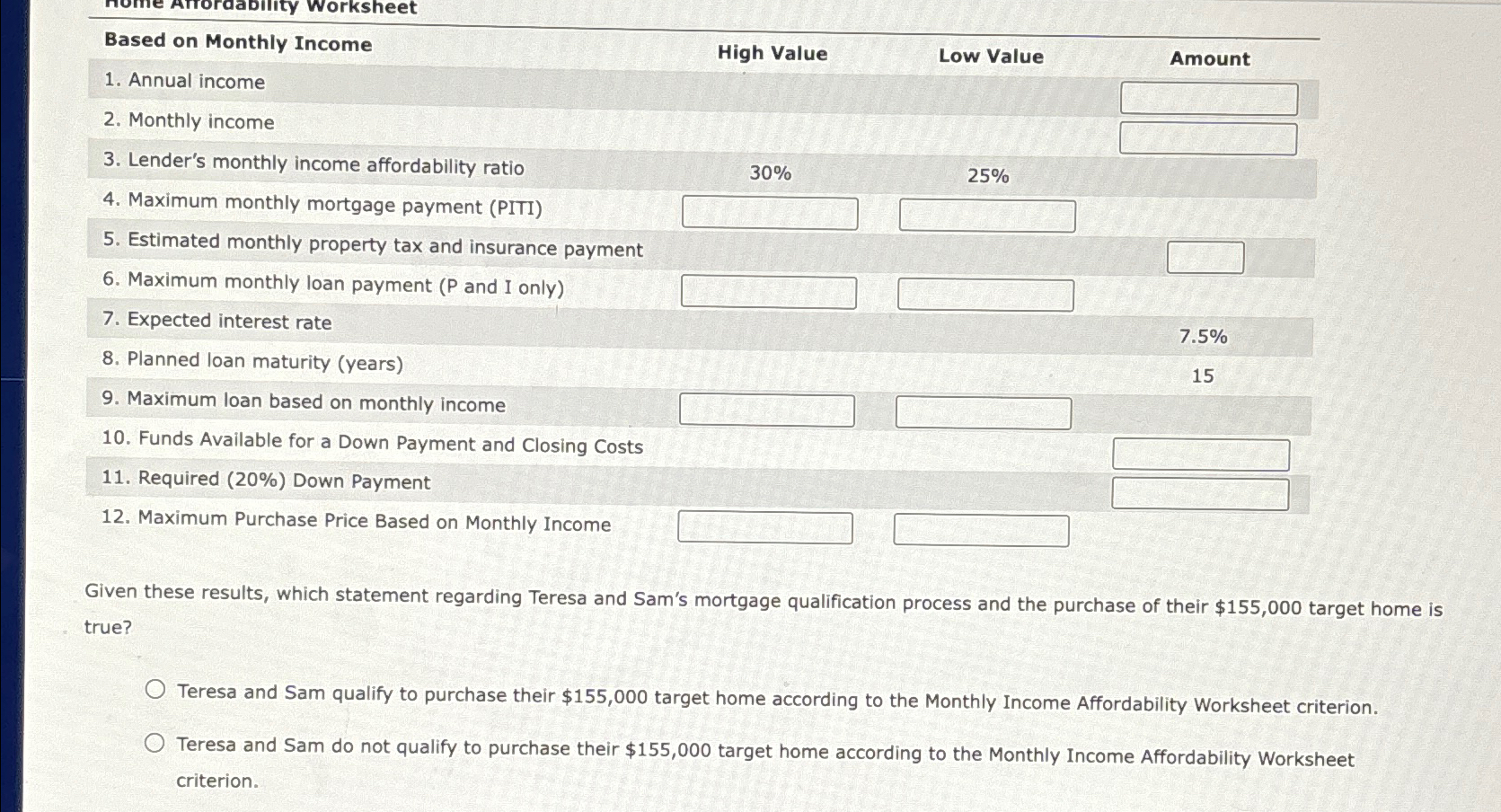 Solved Home Affordability Worksheet #92 table Based on Monthly Chegg com