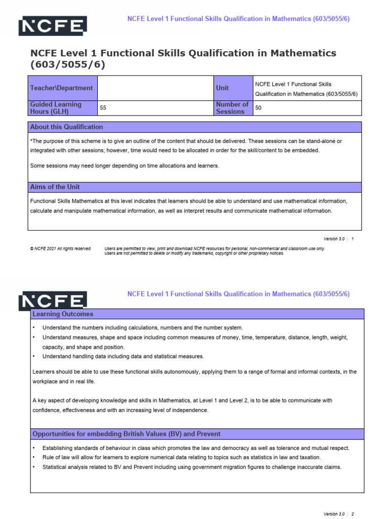 Ncfe Level 1 Functional Skills Qualification in Mathematics Scheme of