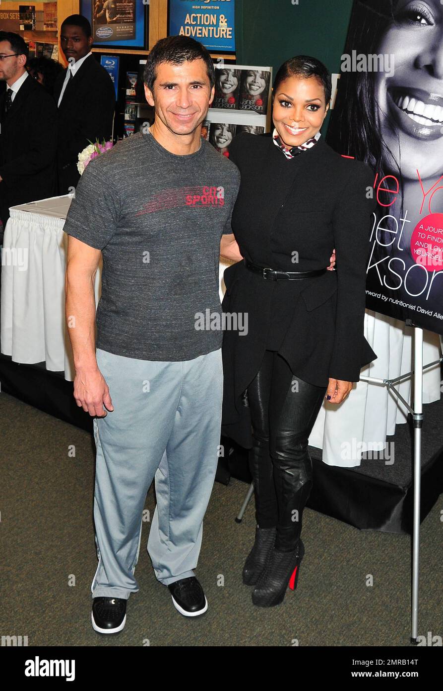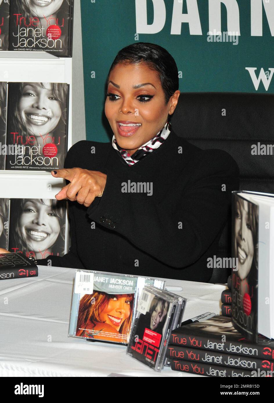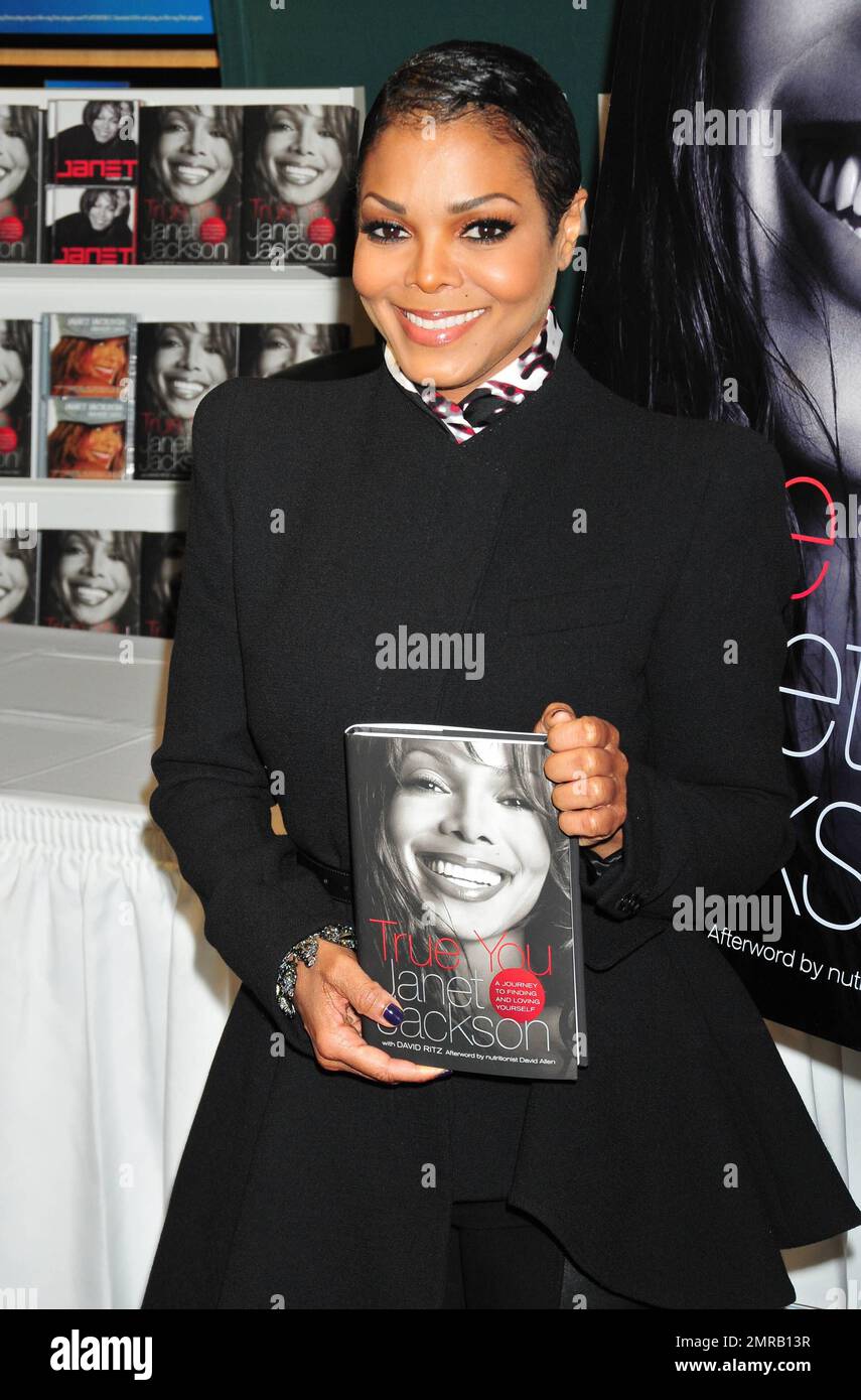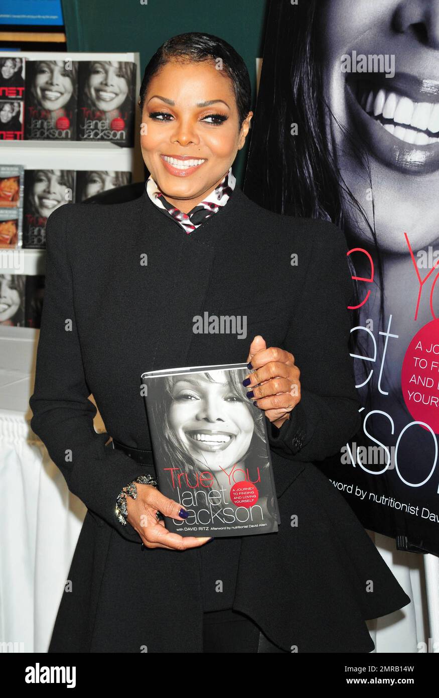 Singer Janet Jackson shows off her short slicked back hair and wears a