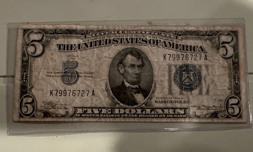 1934A Series $5 Note Silver Certificate Five Dollar Bill Blue Seal