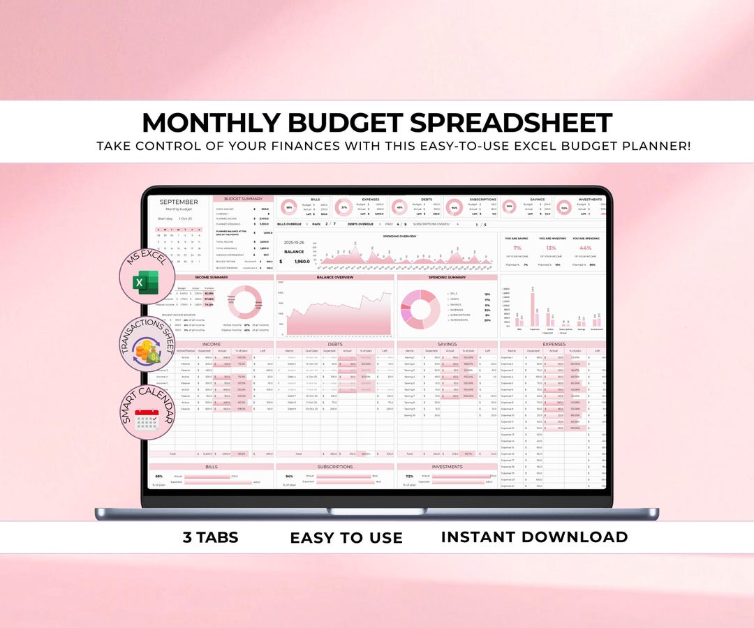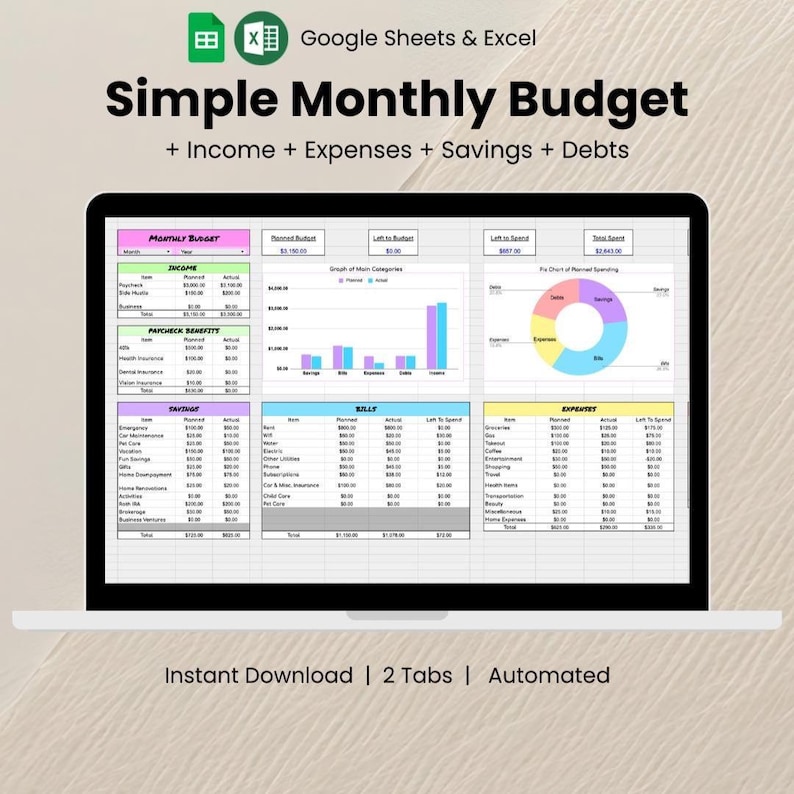 Simple Monthly Budget Spreadsheet · Digital Budget Planner Template for