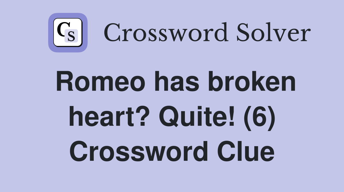 Romeo has broken heart? Quite (6) Crossword Clue Answers Crossword