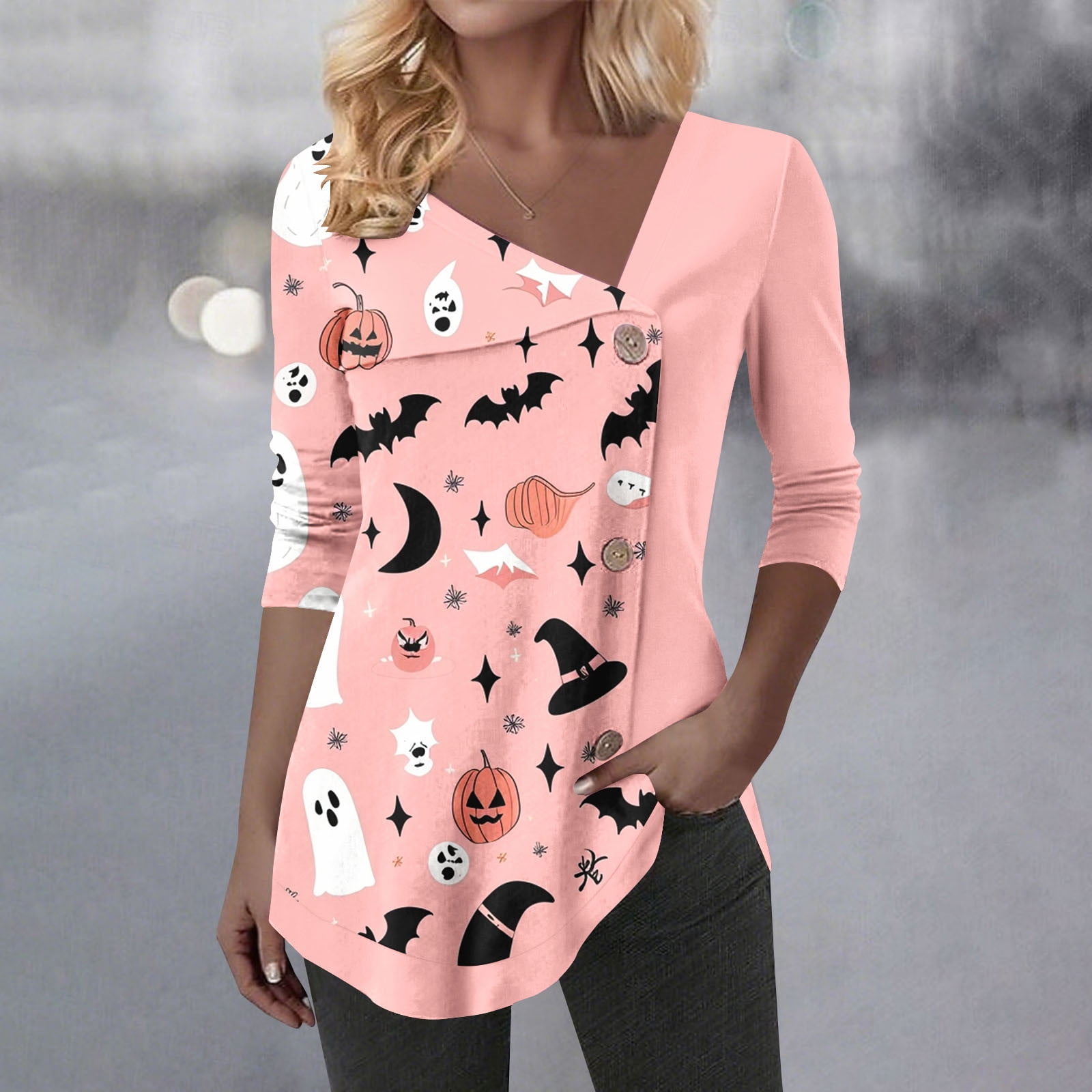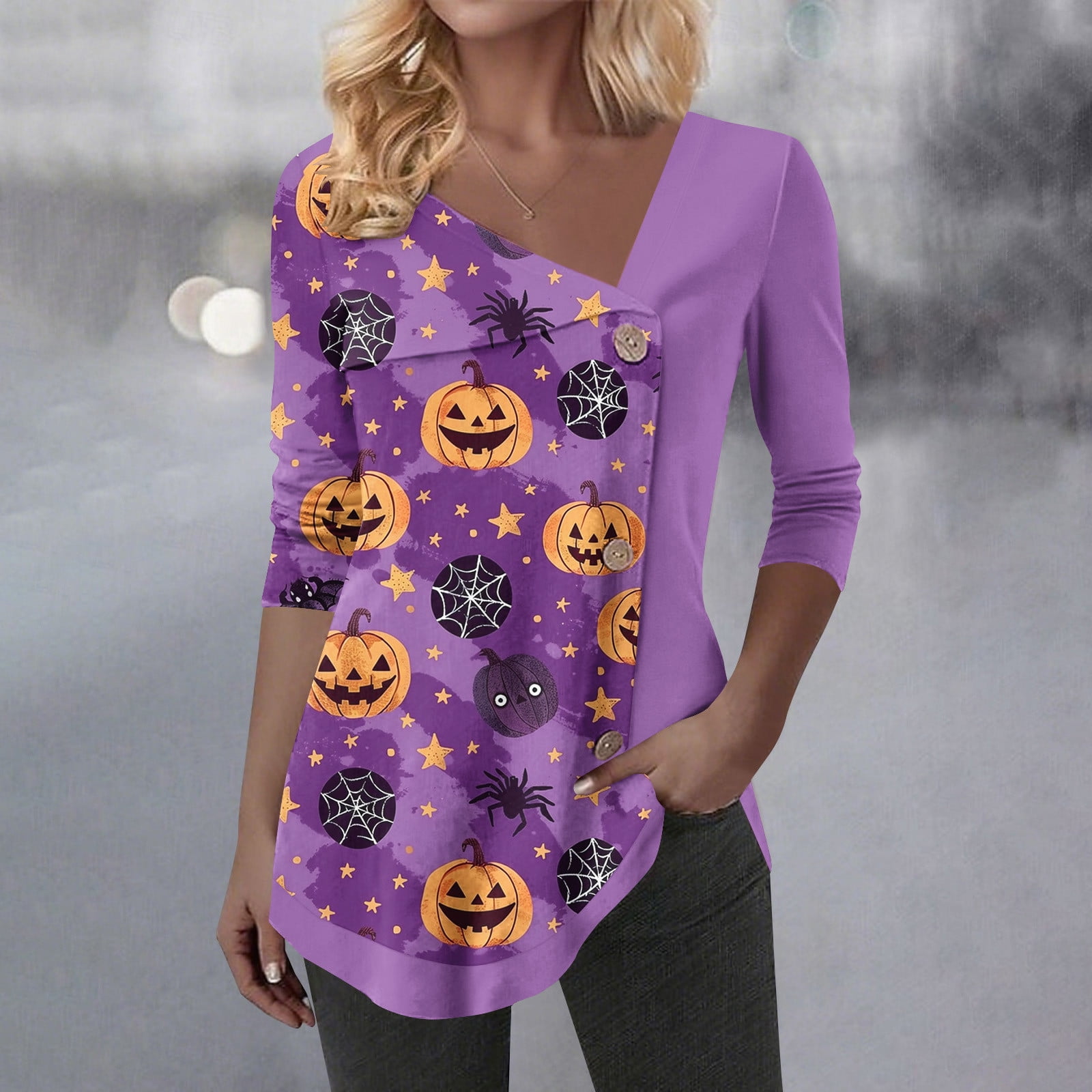 Aueoeo Halloween Women Slanted Shoulder Shirts Long Sleeve V Neck