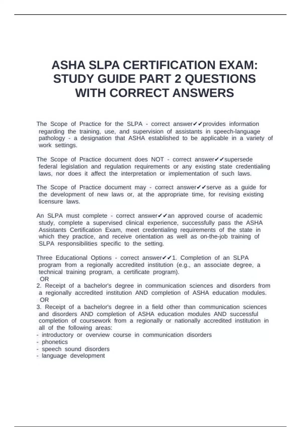 ASHA SLPA CERTIFICATION EXAM: STUDY GUIDE PART 2 CORRECT 100% ASHA