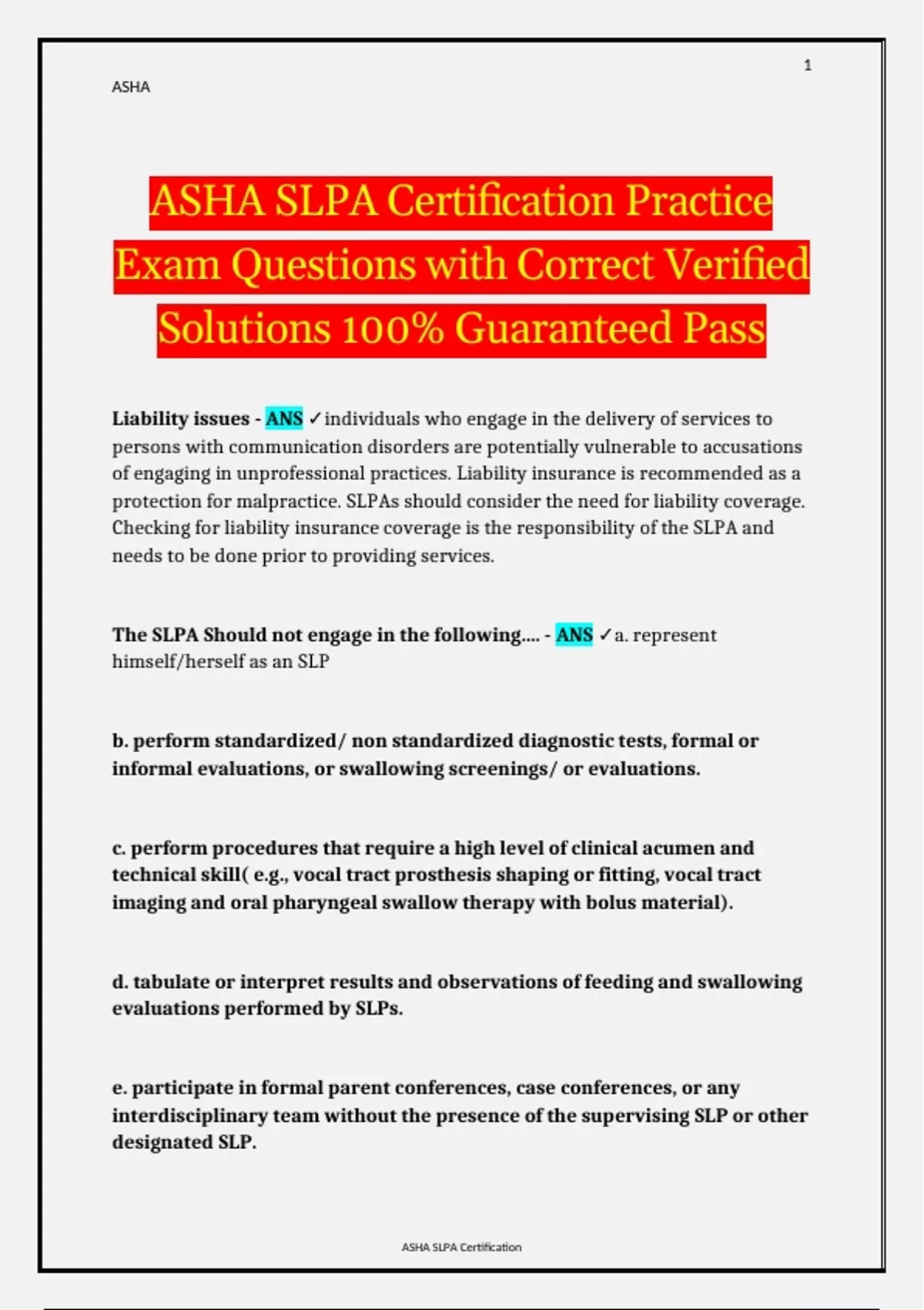 ASHA SLPA Certification Practice Questions ANSWERS Exams Business