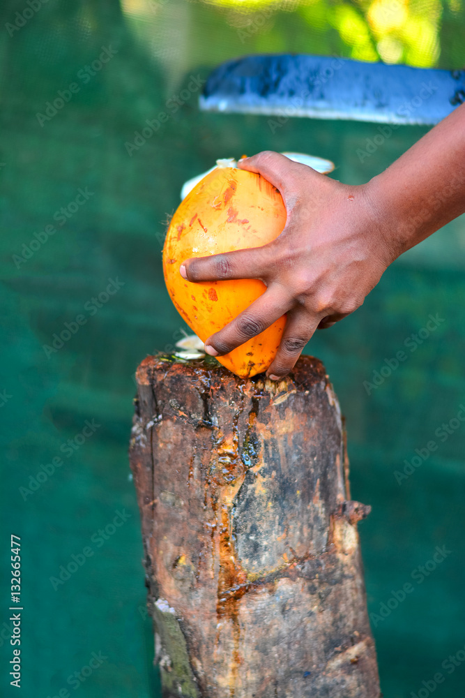 Close Up of King Coconut Fruit Half on Wooden Background Stock Photo