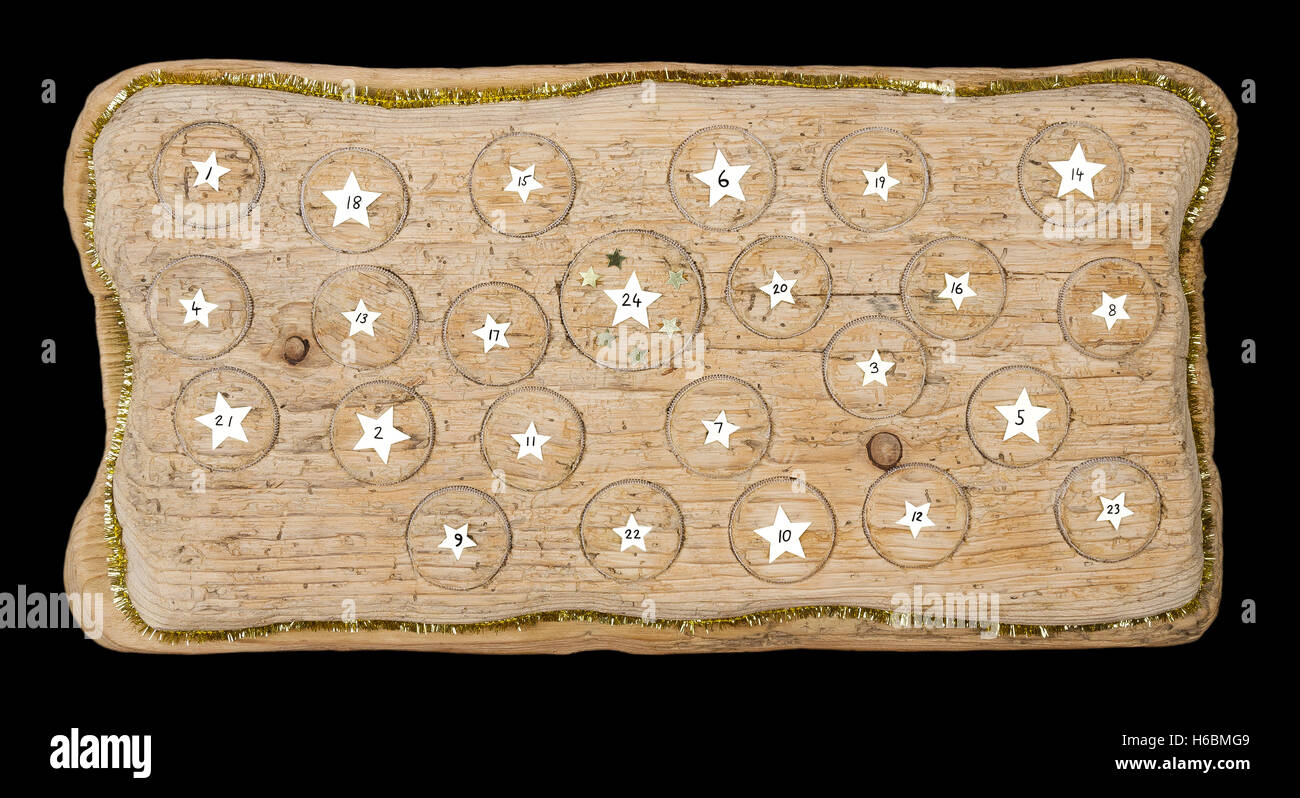 Advent calendar handmade from old timber with circular spaces for small