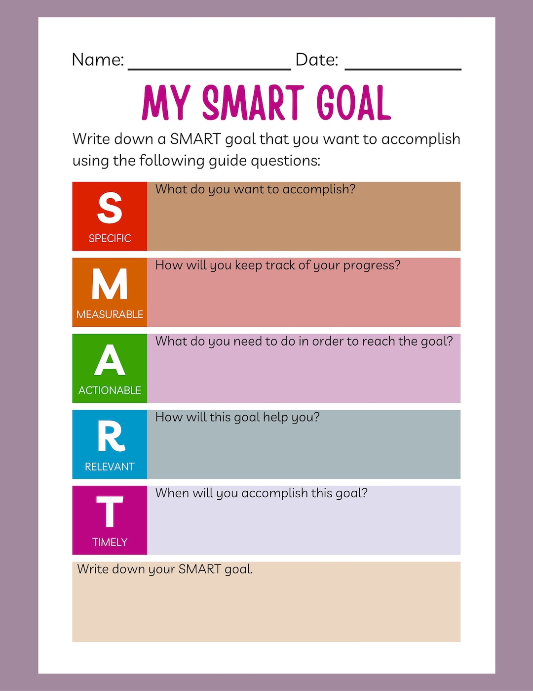 Printable SMART Goals Worksheet for Students Back to School Goal